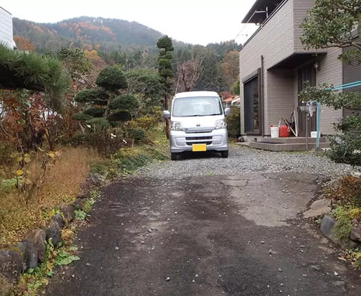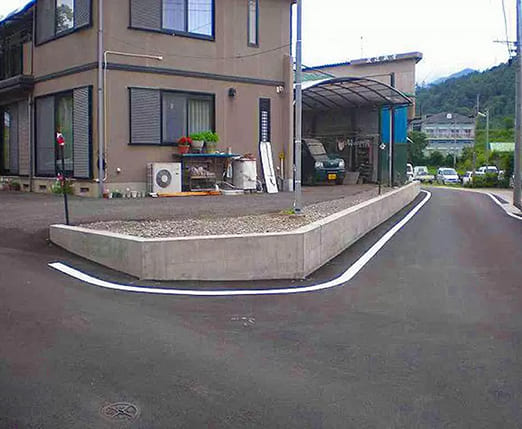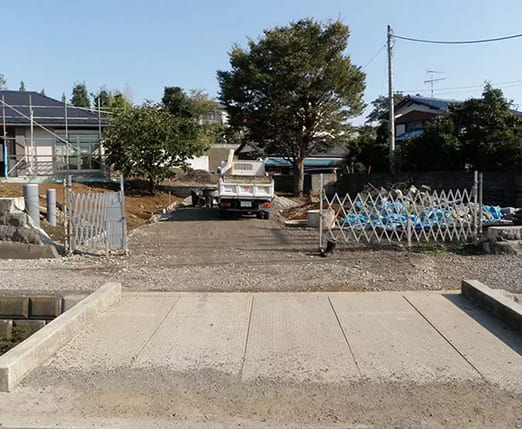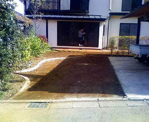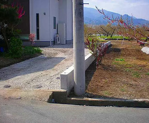 境界部分にコンクリート擁壁を施工し、エントランス、駐車場に砂利を敷きました。