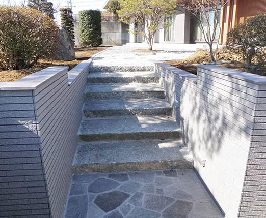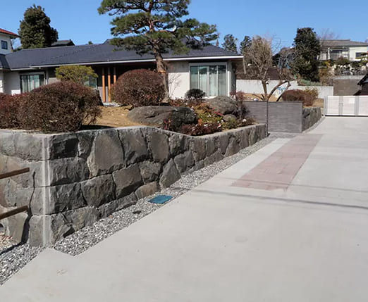 土留石積み、門扉、玄関アプローチ、カーポート、コンクリート舗装を施工しました。