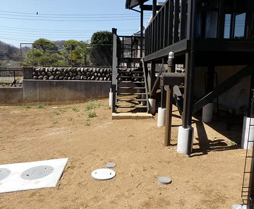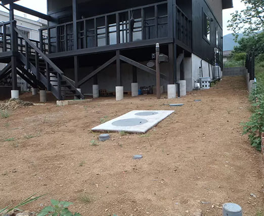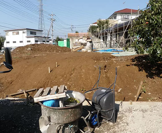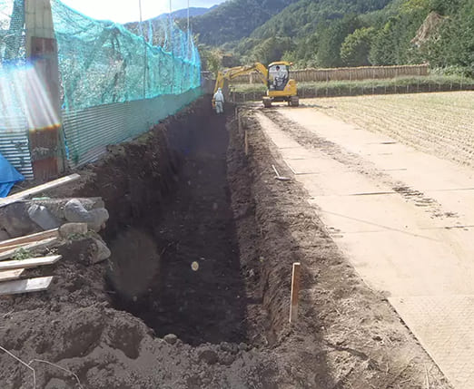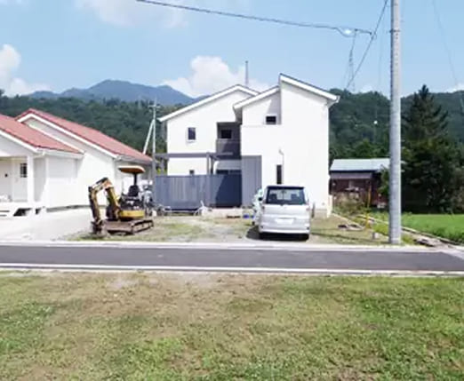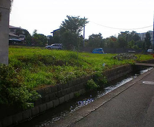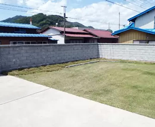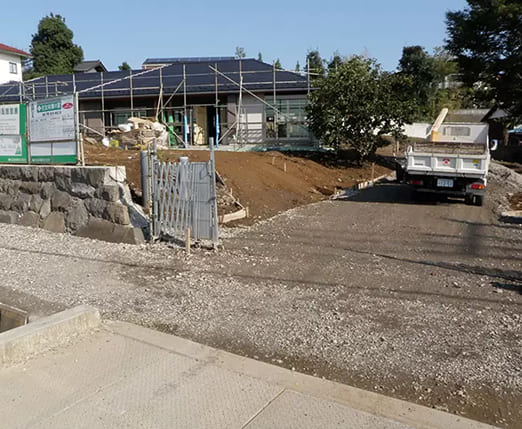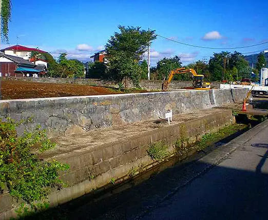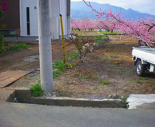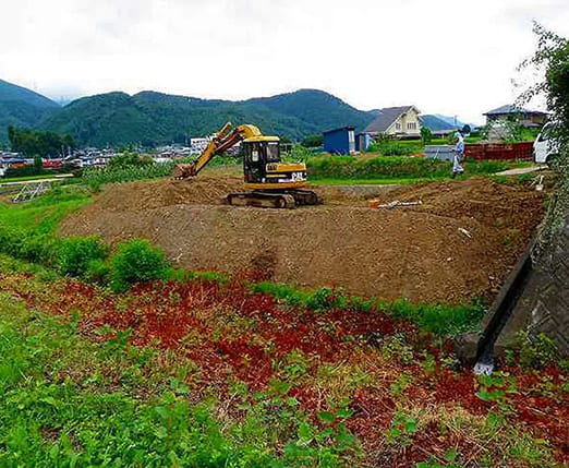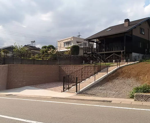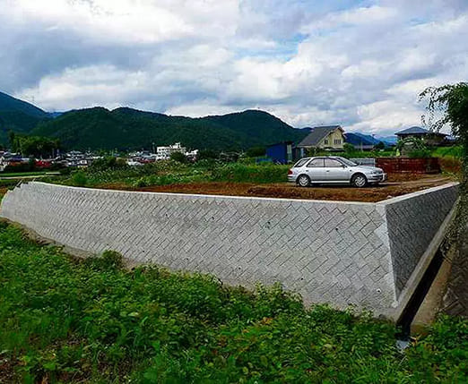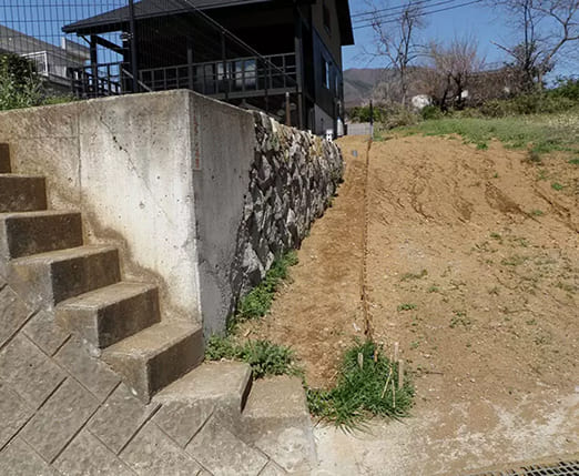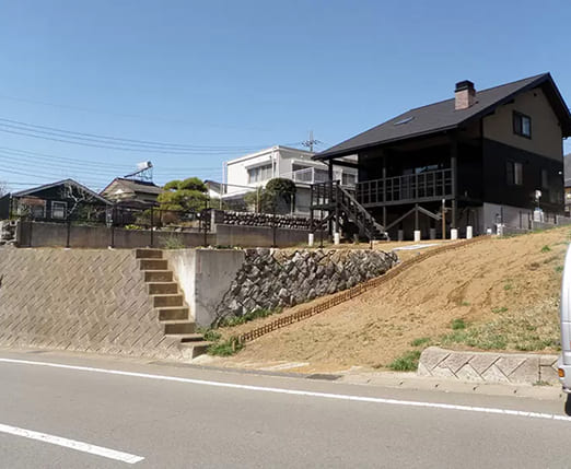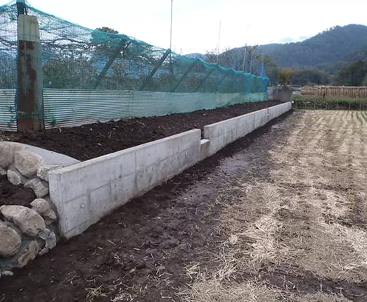道路から3mほど下がった所の田畑を、コンクリートブロック積による土留め擁壁で土地全体を上げて造成しました。