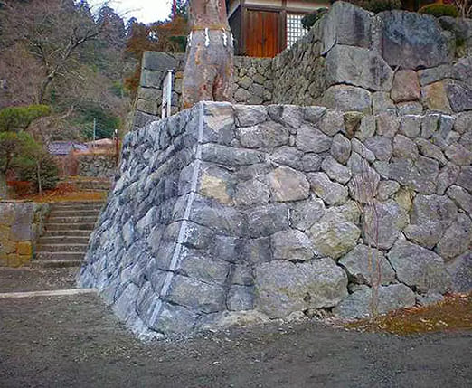 旧石積みの復旧。写真の積み方は、原石を割って石を組み合わせて積んでいます。
