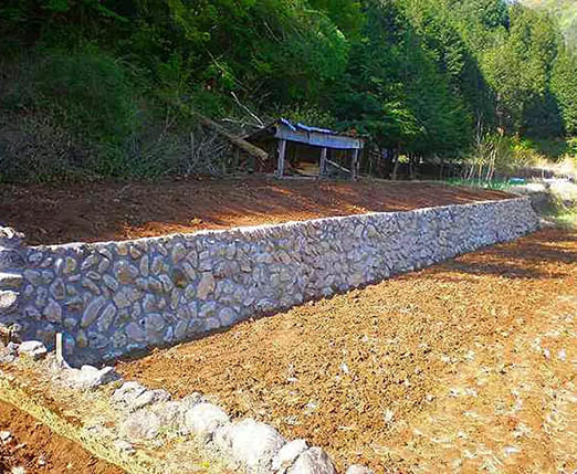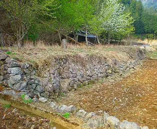 過去の地震、台風などで崩壊した境界部分の石積みを復旧しました。