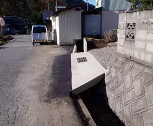 出入り口部分の側溝にグレーチングを設置し、コンクリート舗装とインターロッキングで奥の倉庫前まで施工しました。