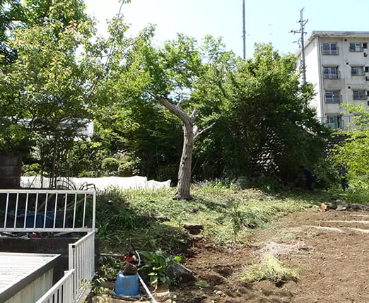 境界に土留めを兼ねた石積みを施工し、土地全体を上げました。 写真の積み方は、原石を割って石を組み合わせて積んでいます。