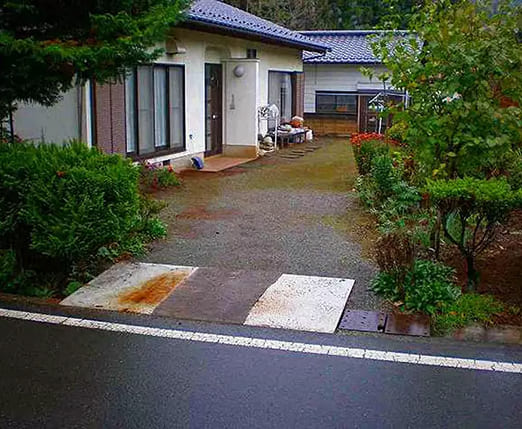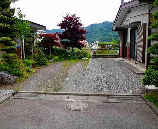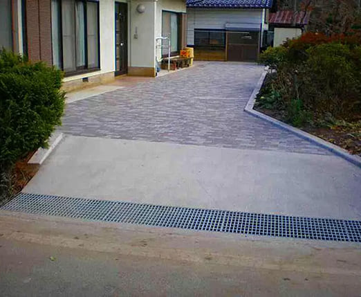 出入り口部分の側溝にグレーチングを設置し、コンクリート舗装とインターロッキングで奥の倉庫前まで施工いたしました。