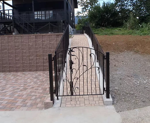 既設ブロック積みをくり抜いて土留と駐車場、玄関までのアプローチ、既設の階段保護のための屋根、庭には人工芝を設置。 門扉、フェンスなども設置しました。