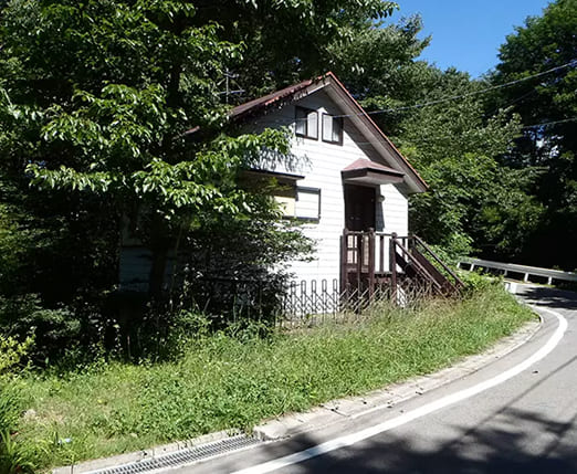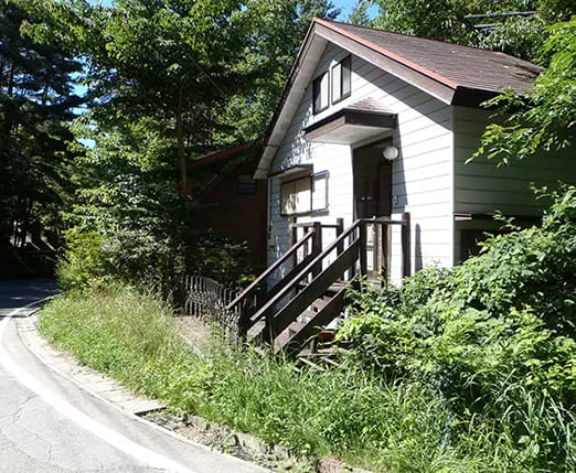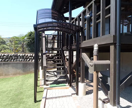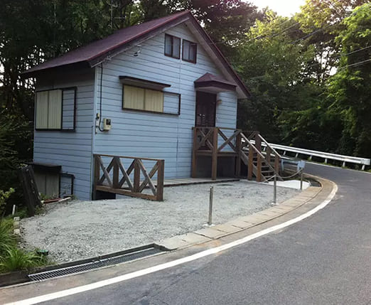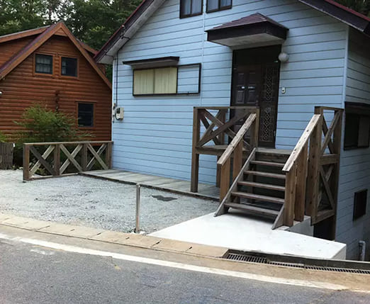 傾斜地の別荘にL型擁壁で駐車スペースを確保し、擁壁と建物の隙間にウッドデッキを設置。 玄関入口の階段と1階部分に下りる階段を設置しました。
