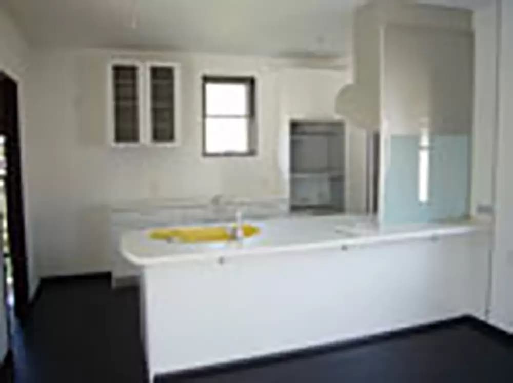傾斜地の別荘にL型擁壁で駐車スペースを確保し、擁壁と建物の隙間にウッドデッキを設置。 玄関入口の階段と1階部分に下りる階段を設置しました。