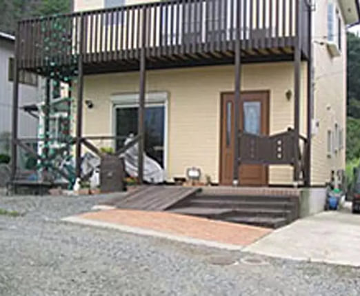 門、テラス、スロープなどの部分をすべて木製の資材で揃えました。